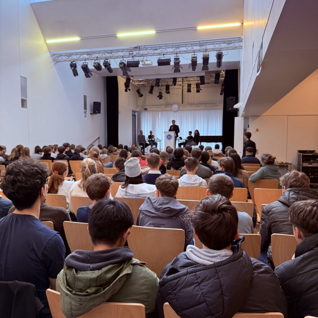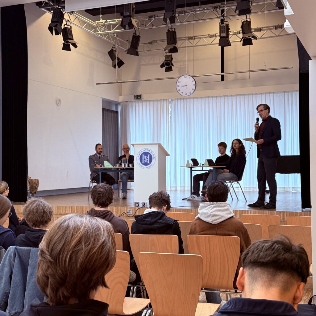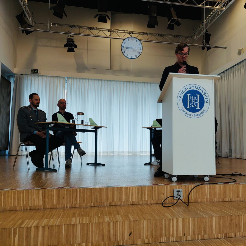 Ende März diskutierten die Schülerinnen und Schüler des Jahrgangs 10 und 11 mit einem Friedensforscher und einem Bundeswehroffizier über das neue Wehrdienstgesetz. Die Veranstaltung wurde von fünf Schüler:innen aus dem Kunst trifft Politik Profil organisiert und moderiert. Von Fragen wie „Wie sind Sie zu Ihrem Beruf gekommen?“ über „Inwieweit stärkt oder schwächt eine neue Wehrpflicht den Frieden?“ bis zu „Was passiert, wenn ich mich bei der Musterung blöd stelle?“ konnten die von dem neuen Gesetz betroffenen Jahrgänge ihre Fragen stellen und zwei Positionen kennenlernen, die sich differenziert zwischen den zwei bekannten Ja / Nein-Positionen bewegen. Danke an alle Beteiligten für die Organisation! Als Belohnung wurde das Planungsteam von der Bergedorfer Zeitung interviewt.